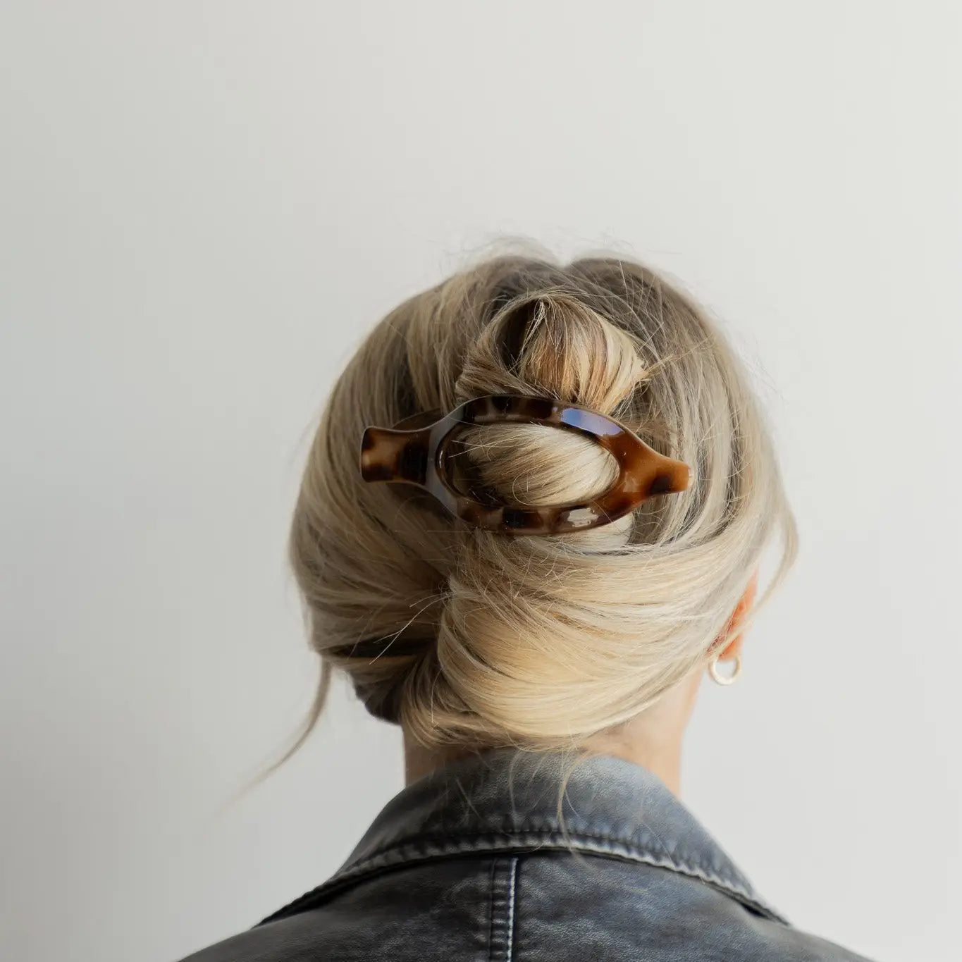 This alligator clip is mighty and perfect for holding all your hair back while you are getting ready in the morning or hanging by the pool. Whatever the occasion it is convenient and stylish. About 5 inches long.